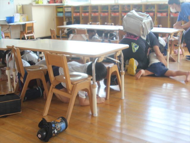 その後、非常ベルが鳴り「給食室から火災‼」との放送があったので、みんな園庭の中央に避難しました