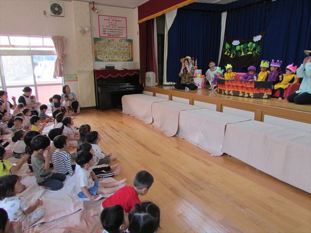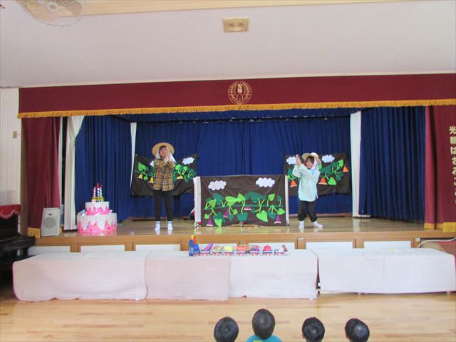始めにおじいさん、おばあさんが登場して畑で採れた秋の食べ物を「くだものれっしゃ」の歌にのせて運んできてくれました